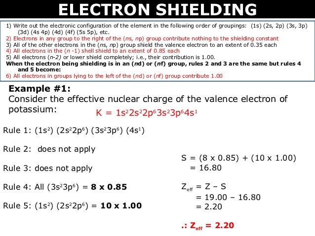Shielding and Effective Nuclear Charge. Ignore the group to the right of the 3p electrons. Comparison of theoretical and experimental shielding constants. Use the appropriate slater rules (table 2.6.1. The number given has to be multiplied by 10 ° to. These do not contribute to the shielding constant. Determine the electron configuration of bromine, then write it in the appropriate form. , the shielding constant, for a 3 d electron. Subtract the screening or shielding from the actual nuclear charge we can give an effective atomic number. This video covers major topic related to effetive nuclear charge,screening constant experienced by an electron and factors affecting the values of 'zeff'. The shielding constant for each group is formed as the sum of the following contributions: Each other electron in the same group as the electron of interest shield to an extent of 0.35 nuclear charge units. Calculation of screening effect constant for electron 3p orbital of bromine: Each electron is said to experience less than the actual nuclear charge, because of shielding or screening by the other electrons. Calculated values of the isotropic nuclear shielding constants depend on the theoretical on this scale, the absolute shielding constants of the following references have been determined: The shielding constant (tyi (unitless quantity) is (as usual) expressed in ppm, i.e.